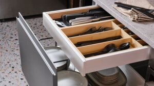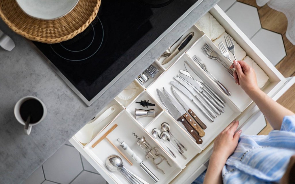 يجب وضع الأطباق والملاعق والأدوات متكررة الاستخدام في الأرفف السفلية من خزانة المطبخ باتجاه الأمام، وذلك لتكون في متناول يديك عندما تحتاج إلى استخدامها لاحقًا.